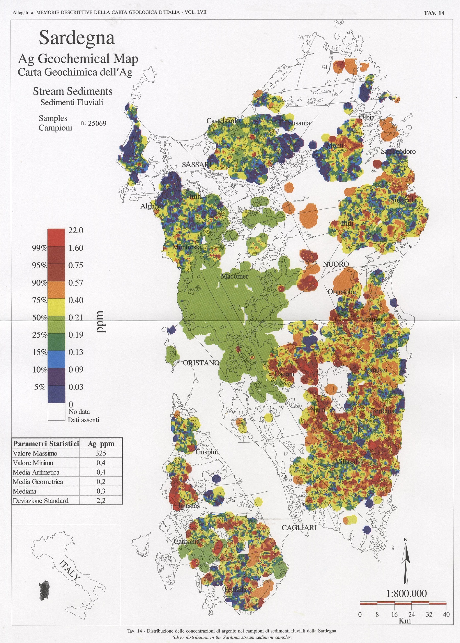 Tav. 14 - Distribuzione delle concentrazioni di argento nei campioni di sedimenti fluviali della Sardegna