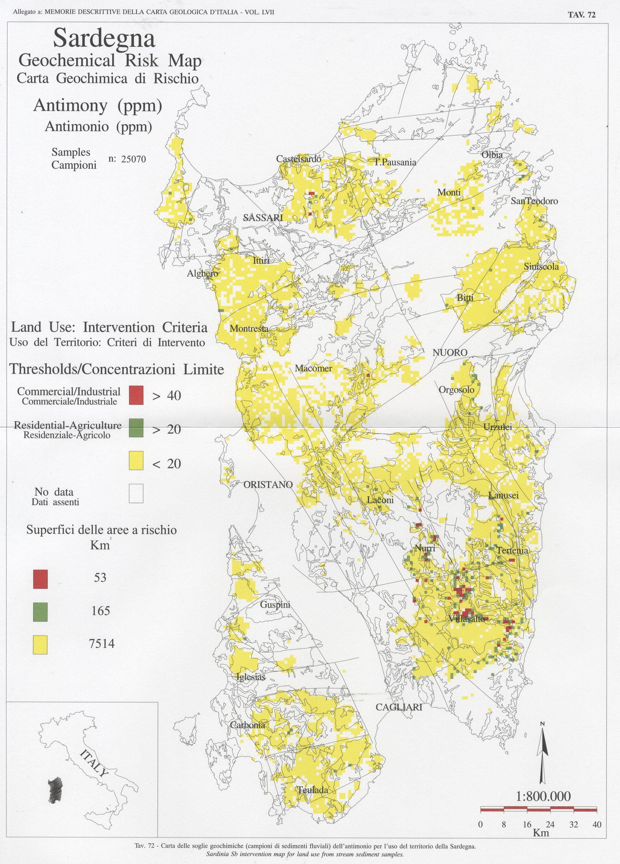 Tav. 72 - Carta delle soglie geochimiche (campioni di sedimenti fluviali) dell'antimonio per l'uso del territorio della Sardegna