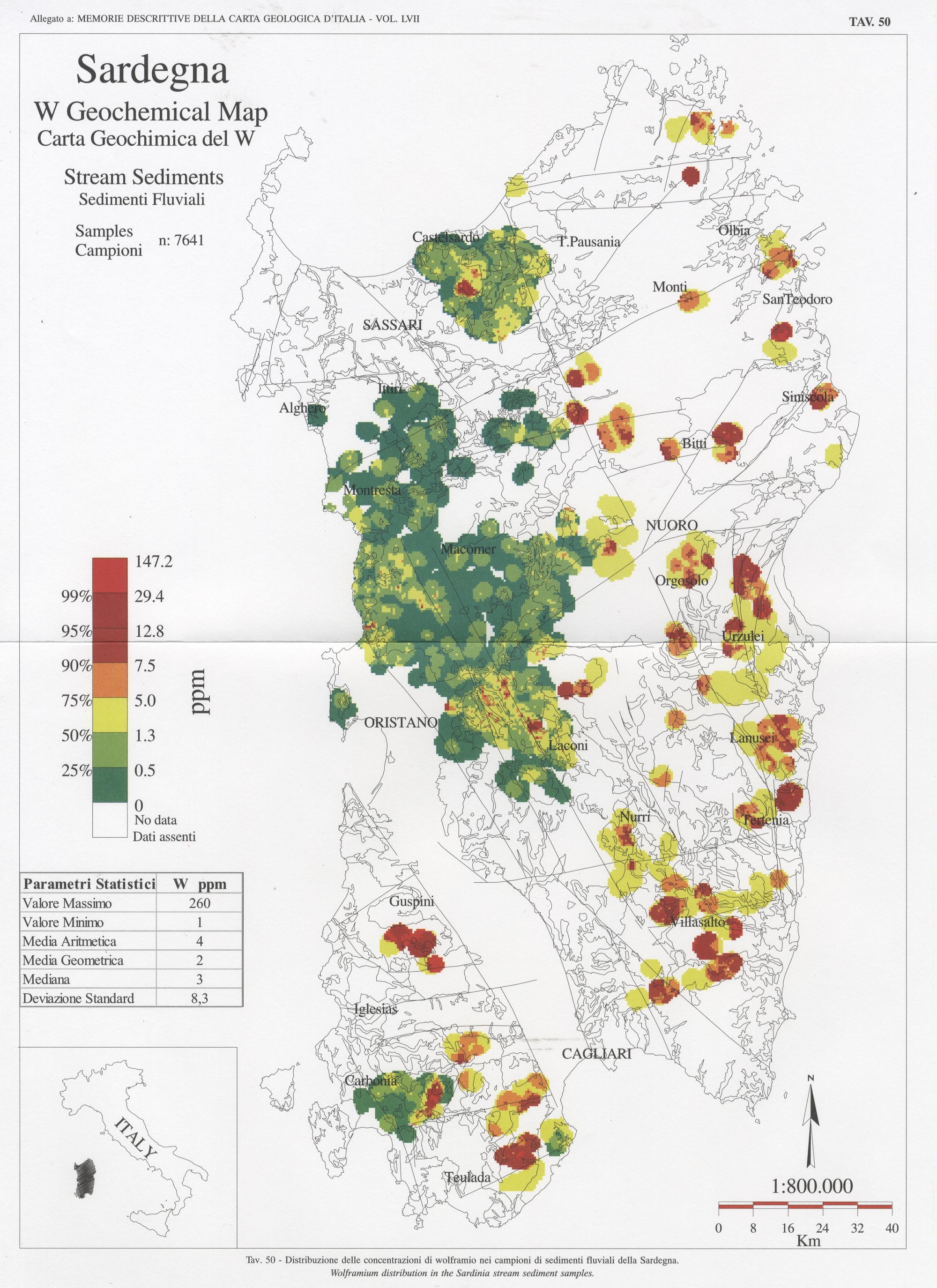 Tav. 50 - Distribuzione delle concentrazioni di wolframio nei campioni di sedimenti fluviali della Sardegna