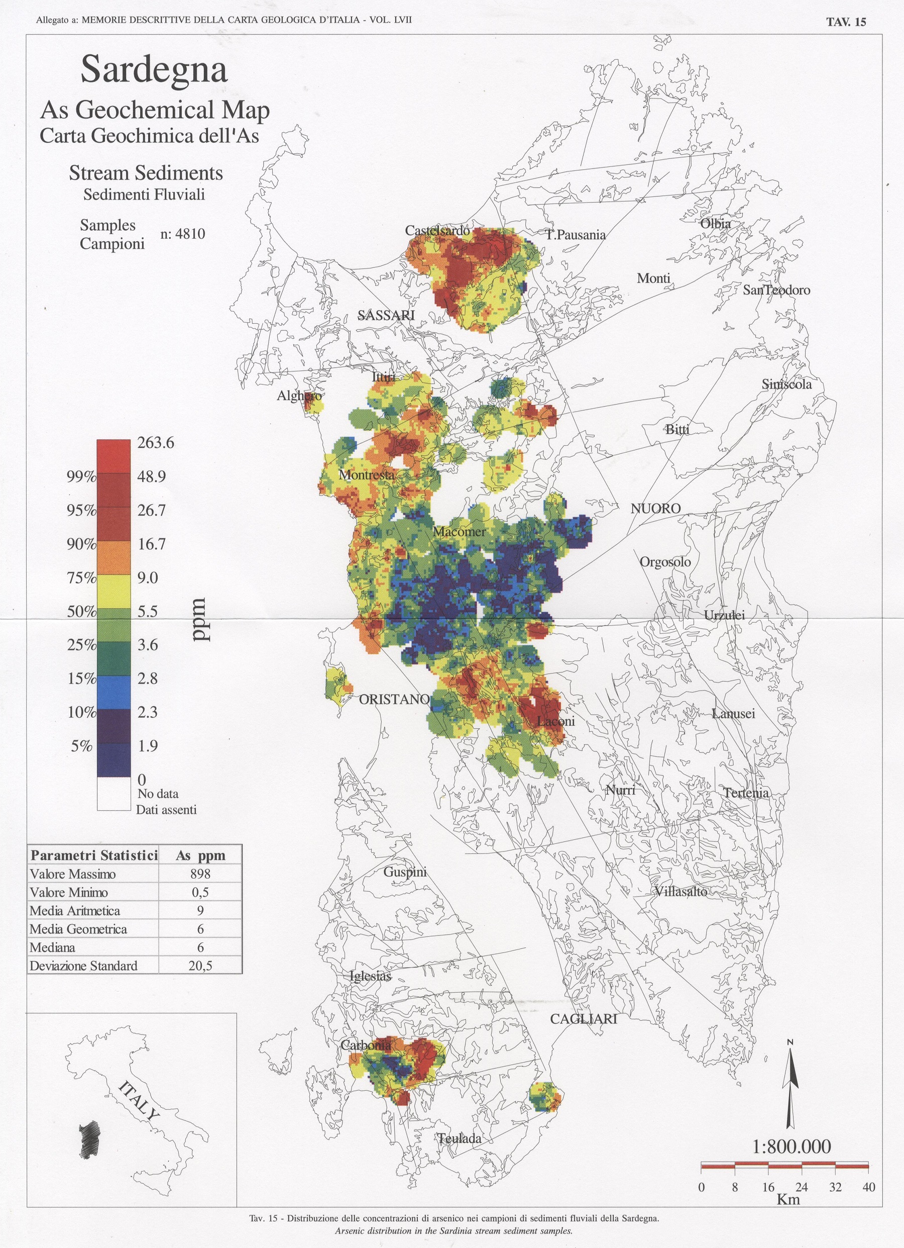 Tav. 15 - Distribuzione delle concentrazioni di arsenico nei campioni di sedimenti fluviali della Sardegna