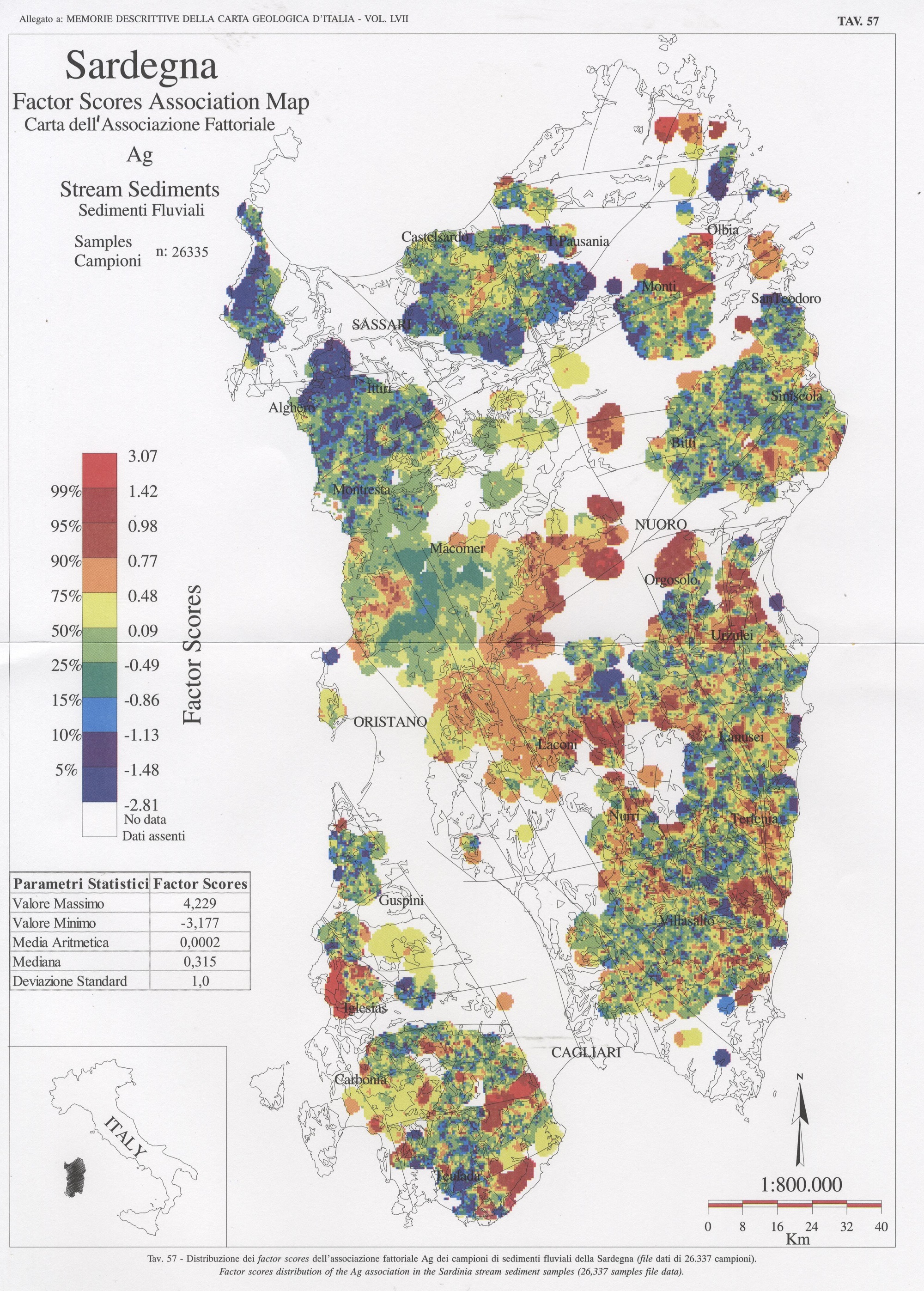 Tav. 57 - Distribuzione dei factor scores dell'associazione fattoriale Ag dei campioni di sedimenti fluviali della Sardegna (file dati di 26.337 campioni)