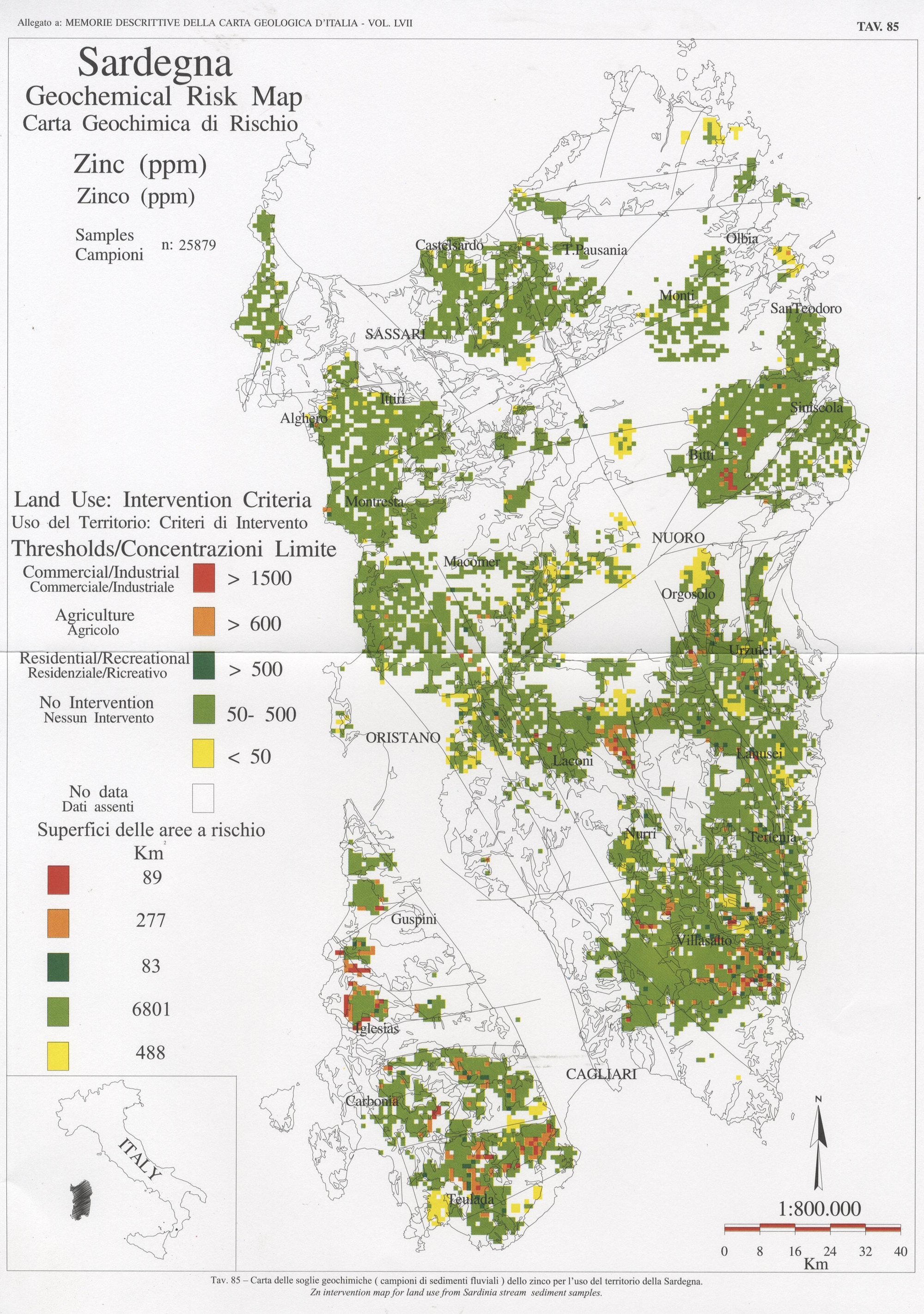 Tav. 85 - Carta delle soglie geochimiche (campioni di sedimenti fluviali) dello zinco per l'uso del territorio della Sardegna