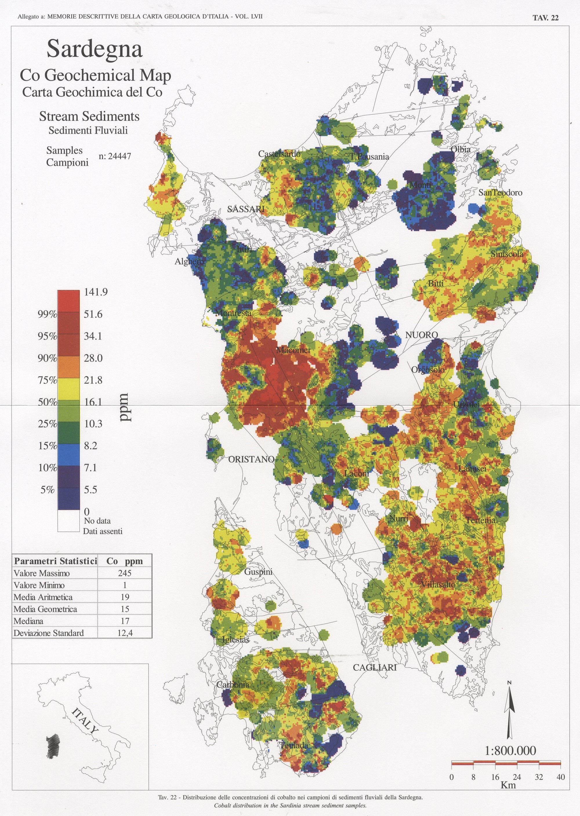 Tav. 22 - Distribuzione delle concentrazioni di cobalto nei campioni di sedimenti fluviali della Sardegna
