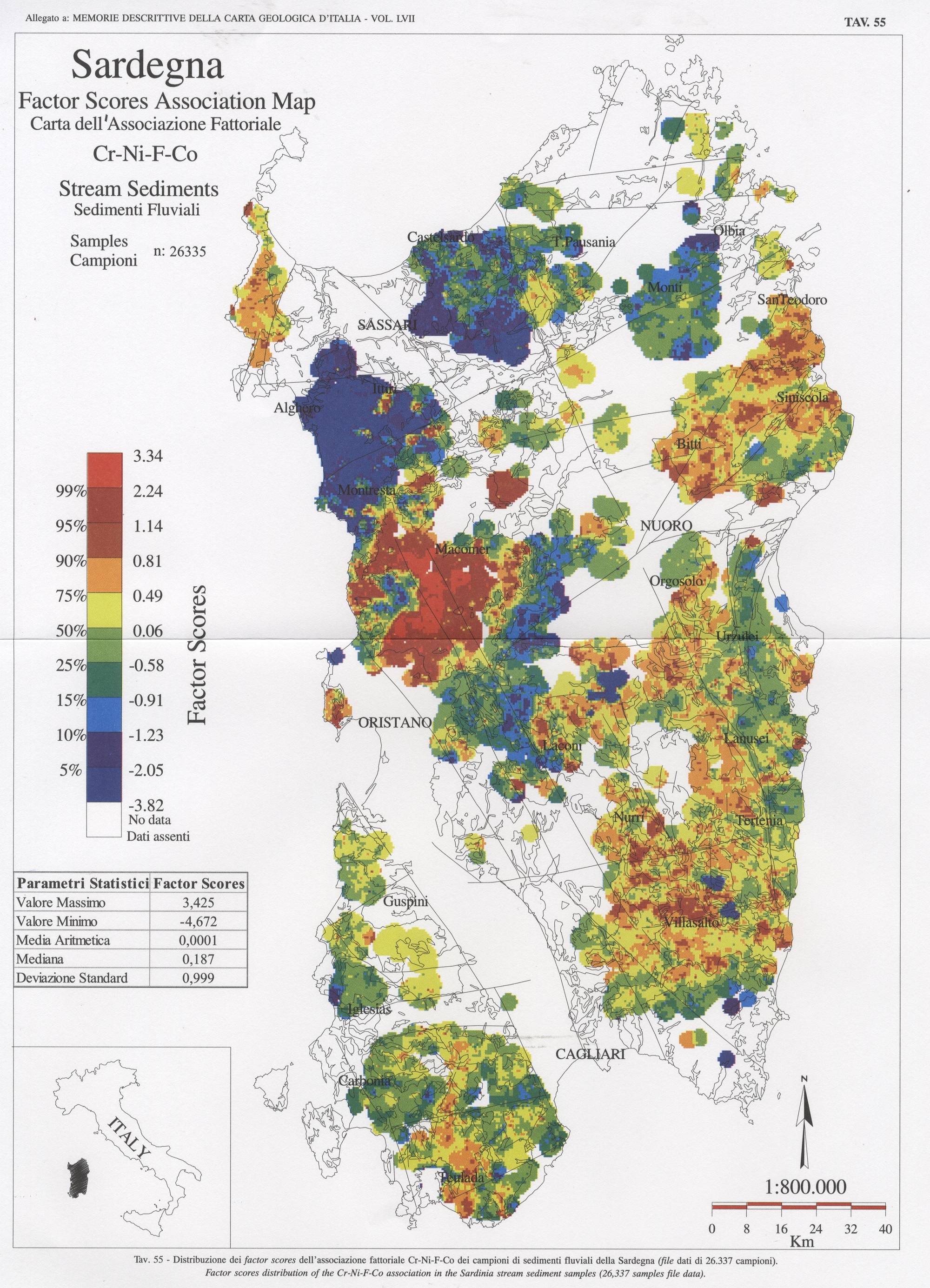 Tav. 55 - Distribuzione dei factor scores dell'associazione fattoriale Cr-Ni-F-Co dei campioni di sedimenti fluviali della Sardegna (file dati di 26.337 campioni)