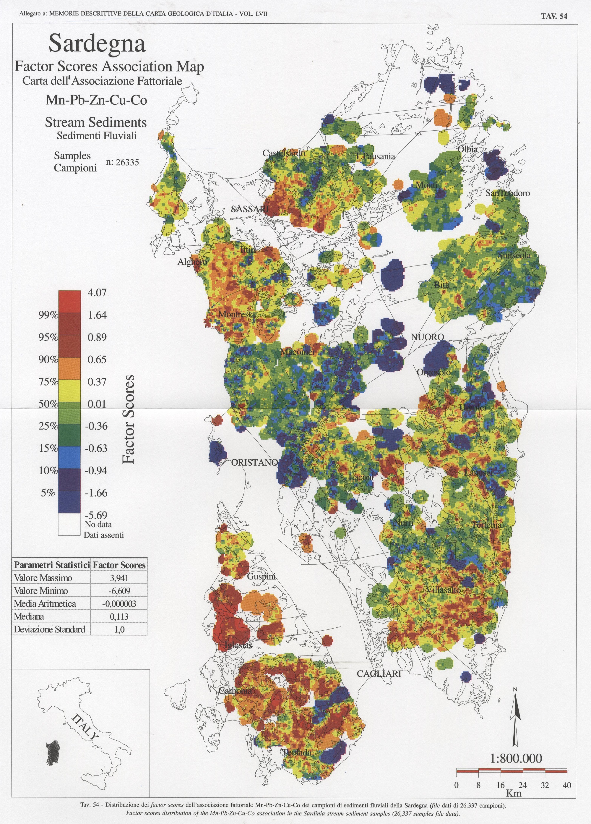 Tav. 54 - Distribuzione dei factor scores dell'associazione fattoriale Mn-Pb-Zn-Cu-Co dei campioni di sedimenti fluviali della Sardegna (file dati di 26.337 campioni)