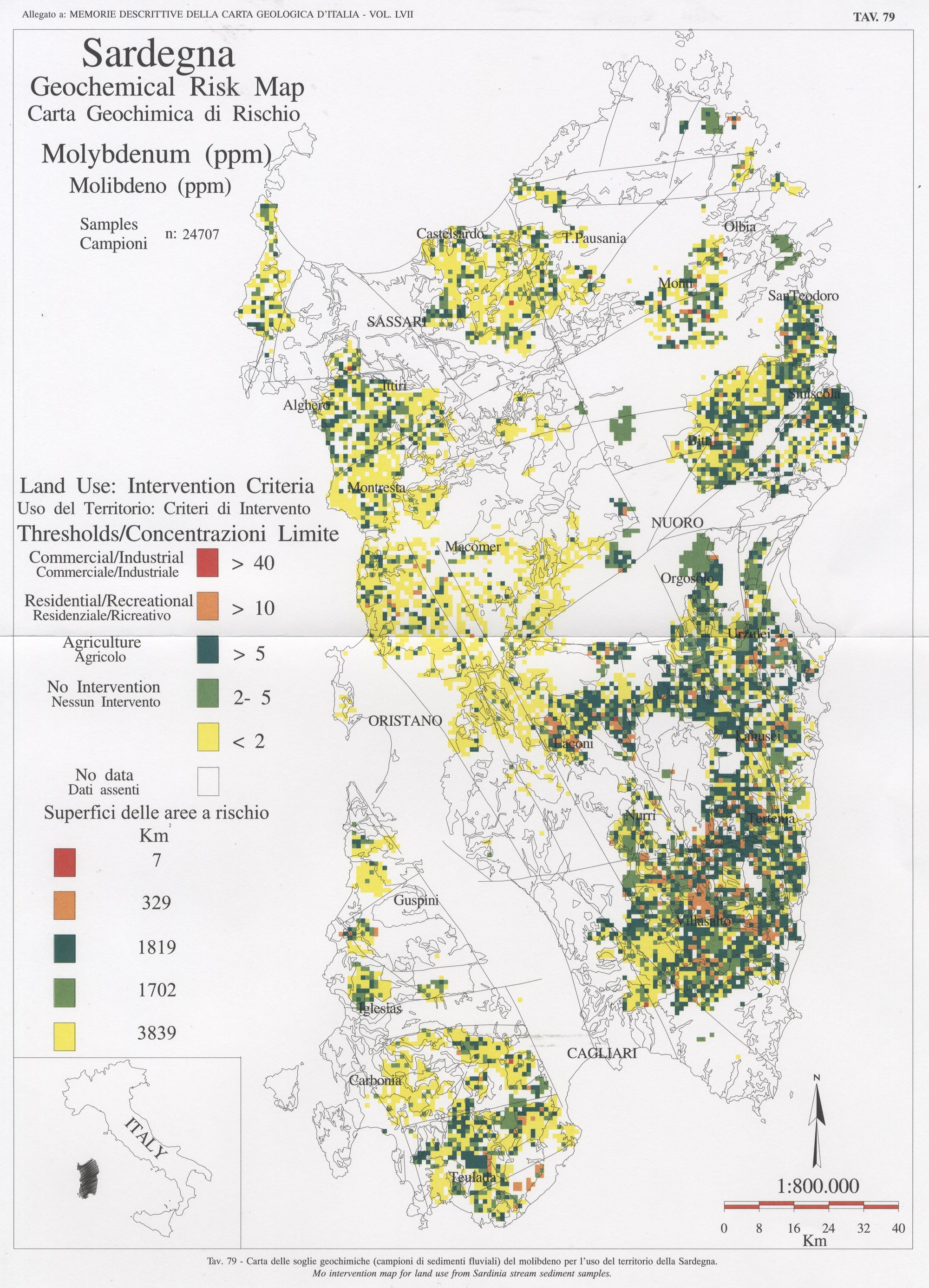 Tav. 79 - Carta delle soglie geochimiche (campioni di sedimenti fluviali) del molibdeno per l'uso del territorio della Sardegna