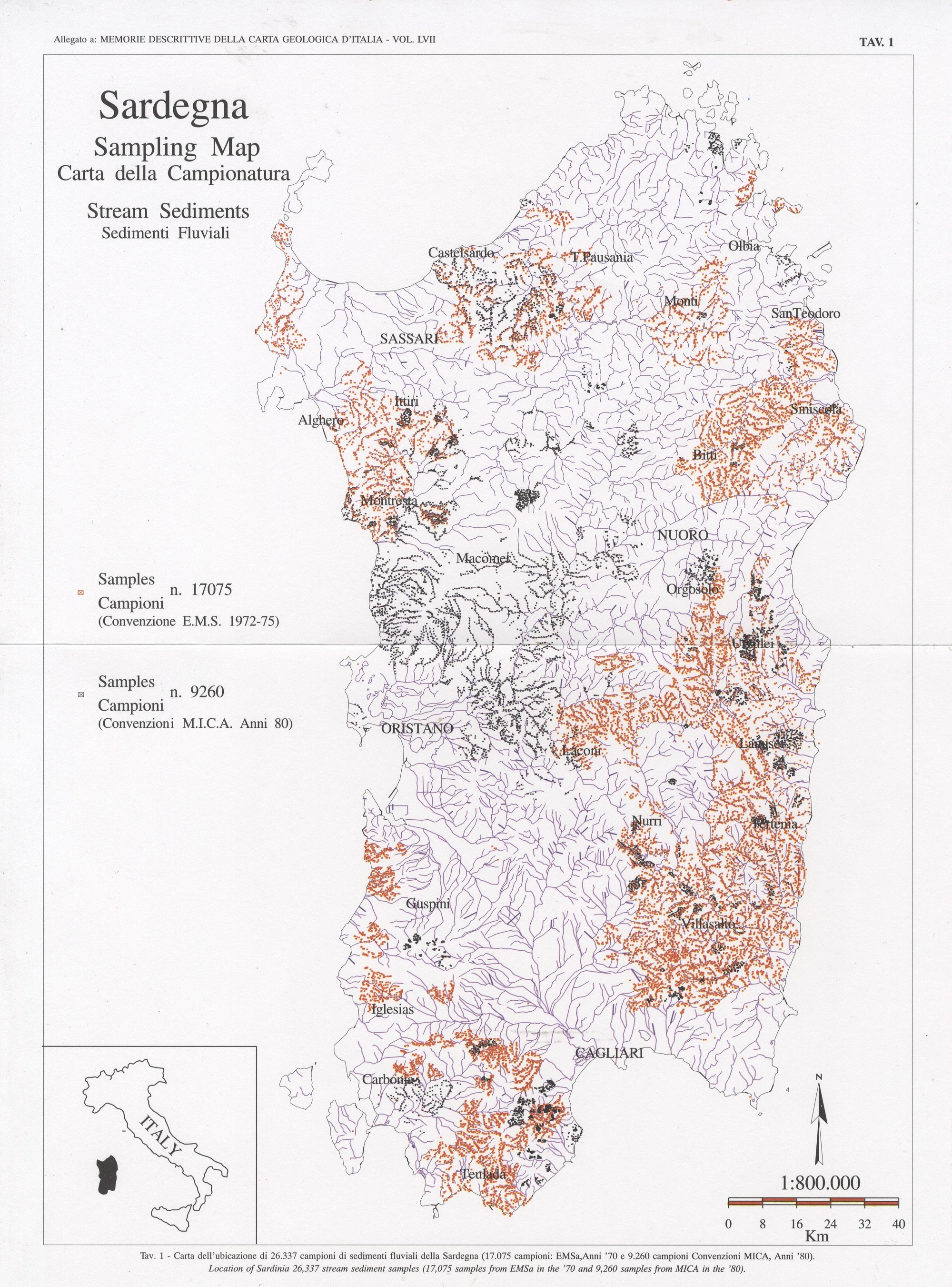 Tav. 1 - Carta dell'ubicazione di 26.337 campioni di sedimenti fluviali della Sardegna (17.075 campioni: EMSa, Anni '70 e 9.260 campioni: Convenzioni MICA, Anni '80