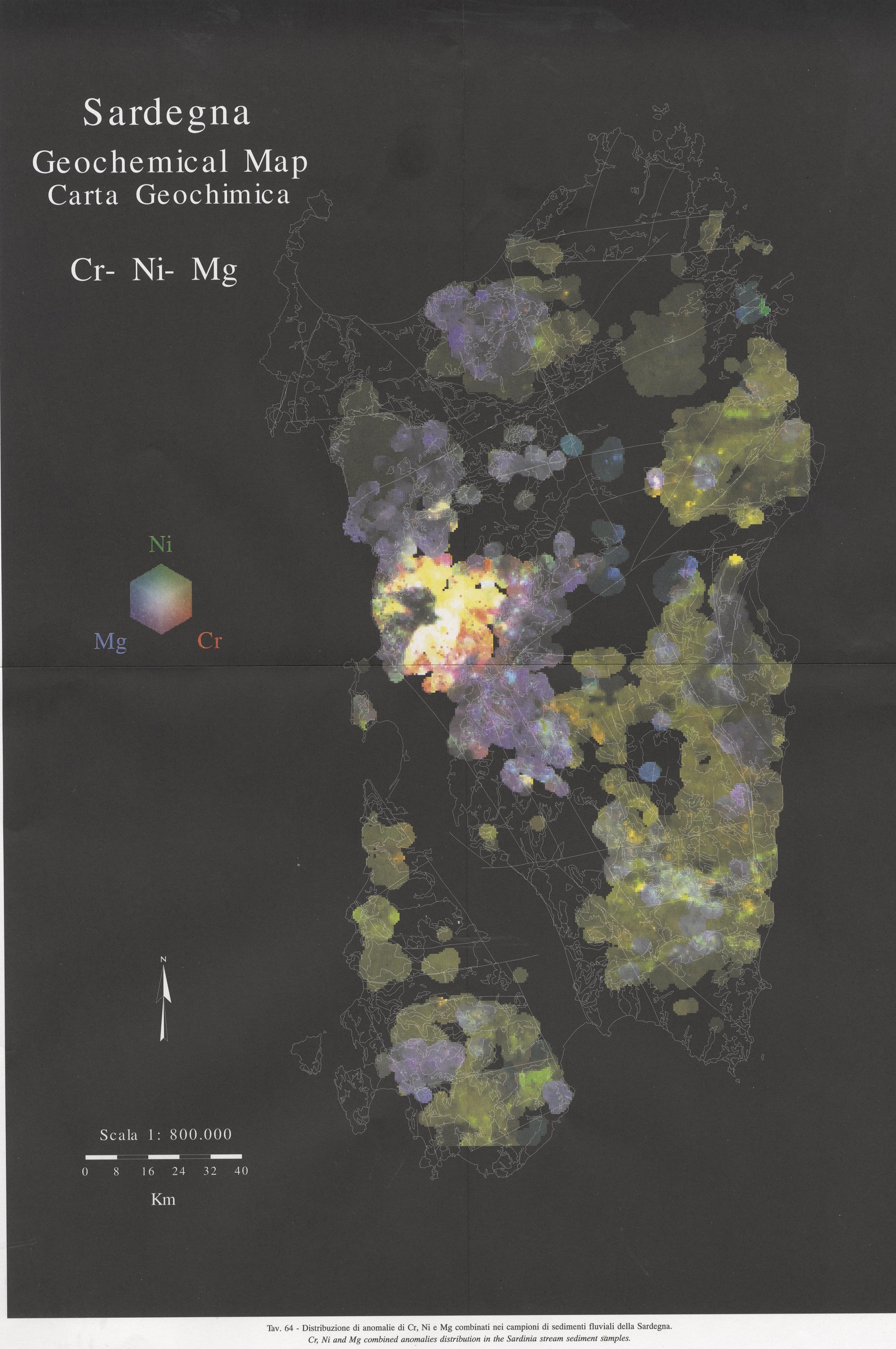 Tav. 64 - Distribuzione di anomalie di Cr, Ni e Mg combinati nei campioni di sedimenti fluviali della Sardegna
