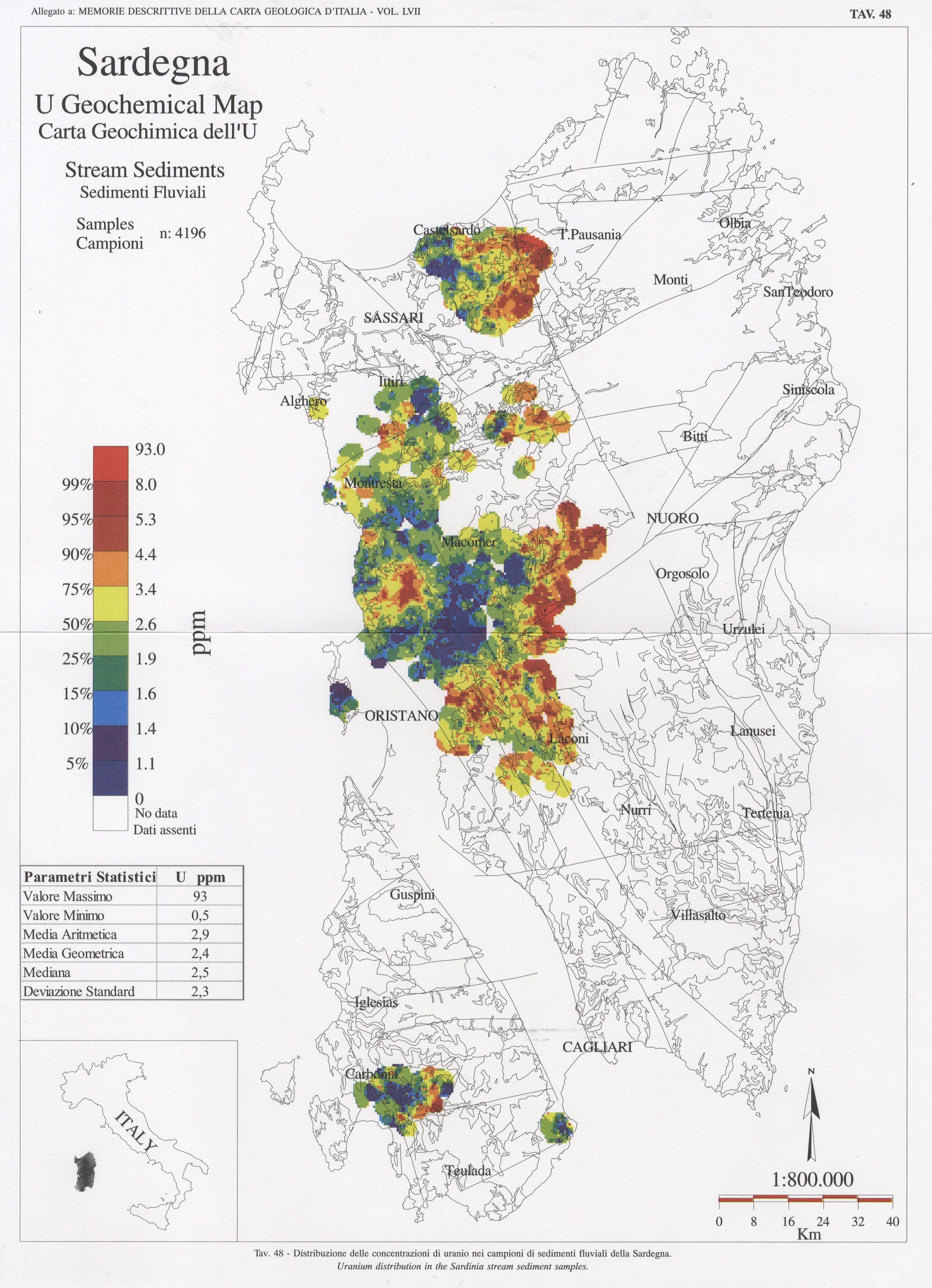 Tav. 48 - Distribuzione delle concentrazioni di uranio nei campioni di sedimenti fluviali della Sardegna