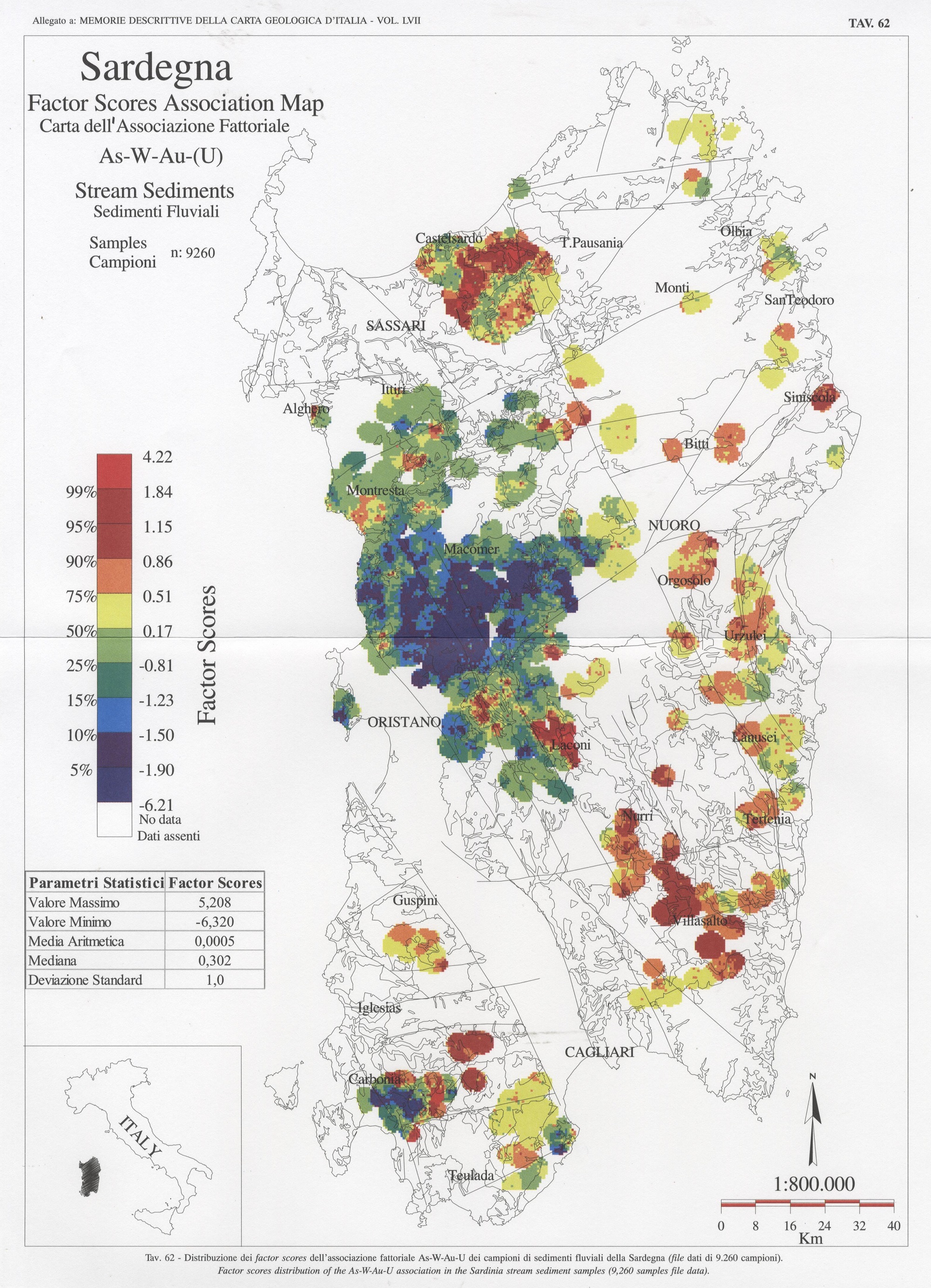 Tav. 62 - Distribuzione dei factor scores dell'associazione fattoriale As-W-Au-U dei campioni di sedimenti fluviali della Sardegna (file dati di 9.260 campioni)