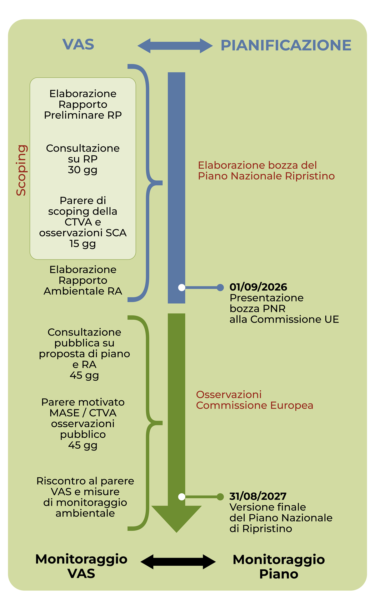 La VAS è un processo continuo che accompagna l’intero ciclo di vita del Piano, è avviata contestualmente al processo di formazione del PNR e ne costituisce una componente strutturale.