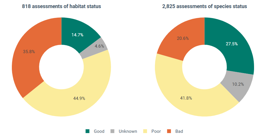 Fonte EEA Stato di conservazione del numero di valutazioni per gli habitat (sinistra) e per le specie (destra) a livello UE protetti dalla Direttiva Habitat 2013-2018, I dati si basano sulle rendicontazioni inviate dagli Stati membri per il IV Report delle Direttive Natura nel 2018, e saranno aggiornati nella primavera del 2026.